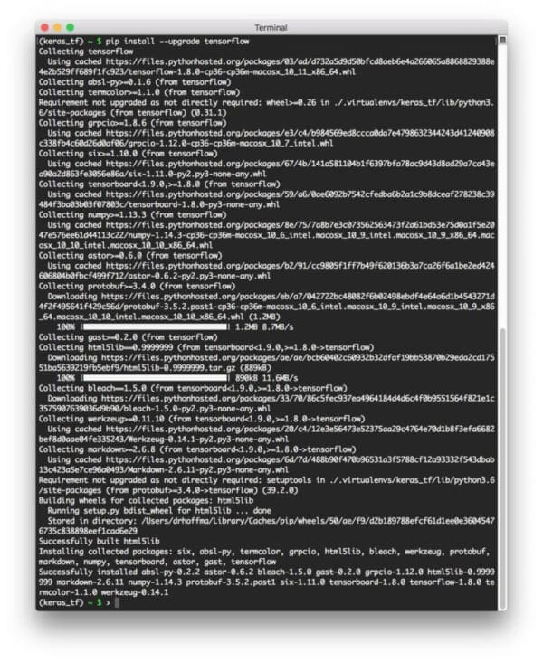 Installing TensorFlow is trivially easy as pip will do all the heavy lifting for us: