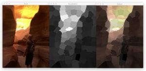 On the left you can see the original input image, a photo of myself exploring Antelope Canyon, arguably the most beautiful slot canyon in the United States. Here we can see a mixture of colors due to the light filtering in from above.