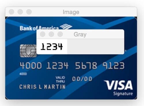 Unfortunately, this is a great example of a limitation of Tesseract. While we have segmented the foreground text from background, the pixelated nature of the text “confuses” Tesseract. It’s also likely that Tesseract was not trained on a credit card-like font.