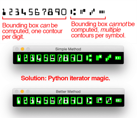 We can’t use a simple contour and bounding box approach. Instead, we need to devise our own method to reliably extract both digits and symbols.