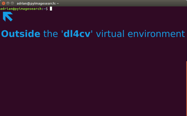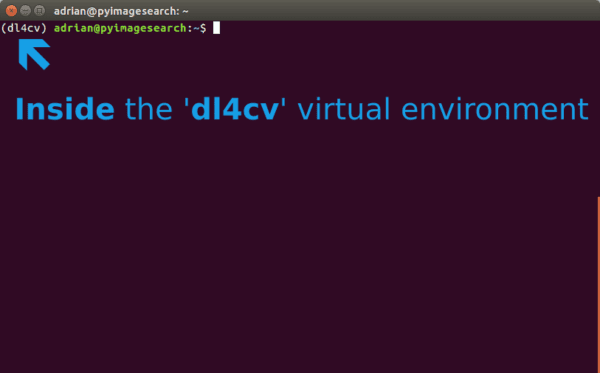 If you ever reboot your Ubuntu system; log out and log back in; or open up a new terminal, you’ll need to use the workon command to re-access your dl4cv virtual environment. An example of the workon command follows: