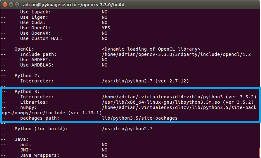 In either case if you do not see the dl4cv virtual environment in these variables’ paths, then it’s almost certainly because you are NOT in the dl4cv virtual environment prior to running CMake!