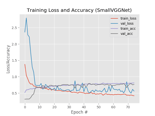 $ python train_vgg.py --dataset animals --model output/smallvggnet.model \