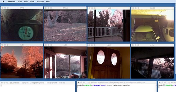 It uses 12 lines of Python code on each Raspberry Pi and 8 lines of Python on the Mac. One Mac can keep up with 8 to 10 Raspberry Pis at 10 FPS. ZMQ is fast.