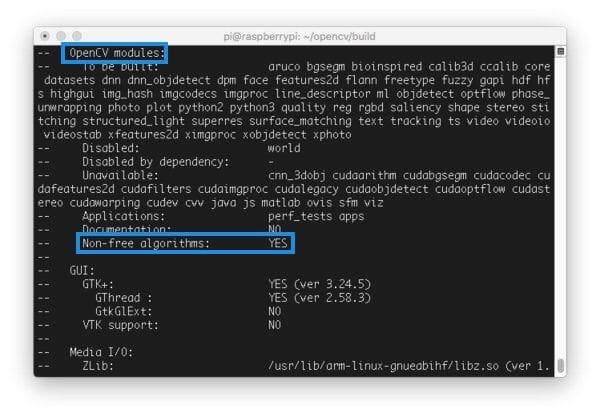 As you can see, “Non-free algorithms” for OpenCV 4 will be compiled + installed.
