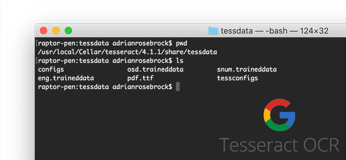 $ cd tessdata/ $ pwd /Users/adrianrosebrock/Desktop/tessdata
