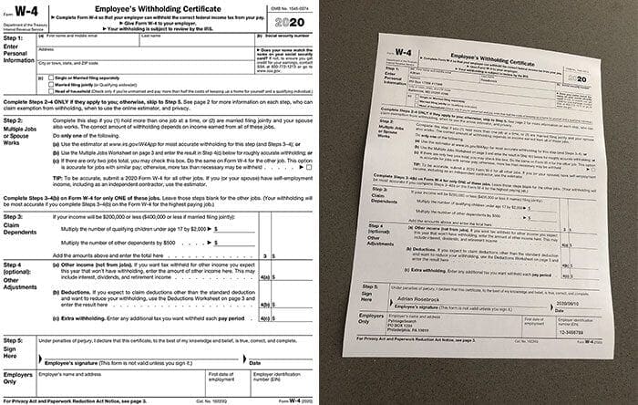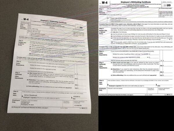 On the left we have our template W-4 form, while on the right we have a sample W-4 form I have filled out and captured with my phone.