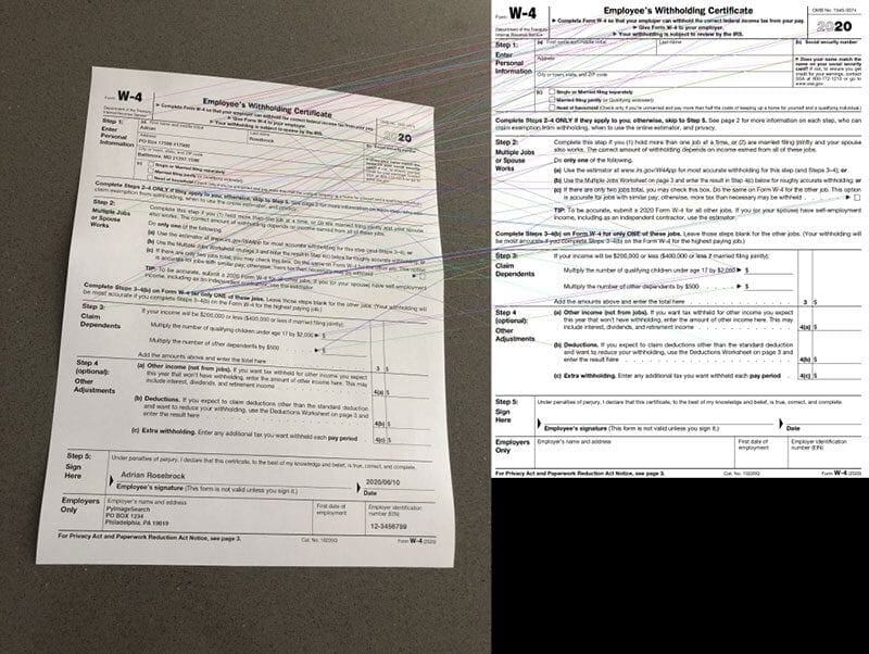 On the left you can see the input image (after alignment), while the right shows the original W-4 template image.