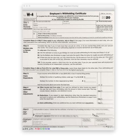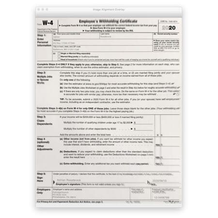 By applying image alignment and registration, we are able to align the input image with the form_w4.png template: