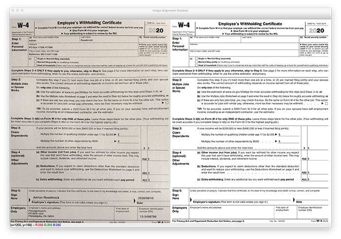 : Contains two JPG testing photos of a tax formscans/: Our template image of the official 2020 IRS W-4 formform_w4.png