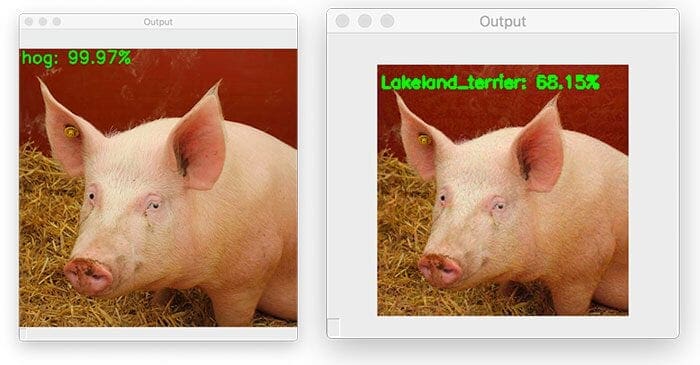 Here you can see that our input pig.jpg image is classified as a “hog” with 99.97% confidence.