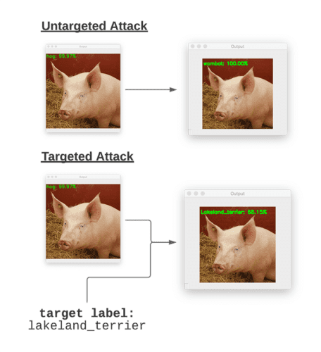 Figure 3 (bottom) is an example of a targeted adversarial attack. We once again input our image of a “pig”, but we also supply the target class label of the perturbed image (which in this case is a “Lakeland terrier”, a type of dog).