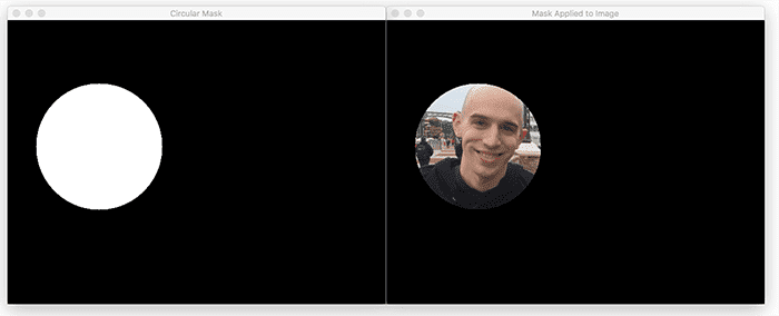 Here, we can see that our circle mask is shown on the left and the application of the mask on the right. Unlike the output from Figure 3, when we extracted a rectangular region, this time, we have extracted a circular region that corresponds to only my face in the image.