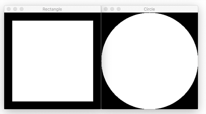 In Figure 2, we can see the white pixels that comprise the rectangle and circle, respectively, all have pixel values that are on, whereas the surrounding pixels have a value of off.