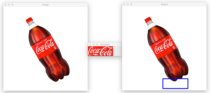 $ python single_template_matching.py \ --image images/coke_bottle_rotated.png \ --template images/coke_logo.png [INFO] loading images... [INFO] performing template matching...