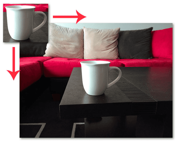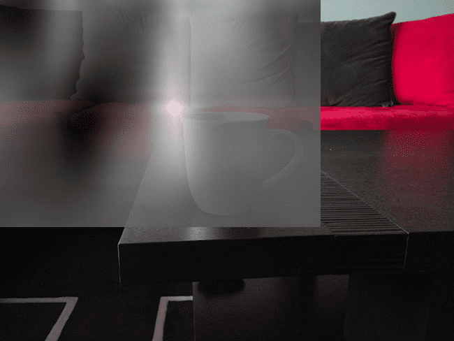 Bright locations of the result matrix R indicate the best matches, where dark regions indicate there is very little correlation between the source and template images. Notice how the result matrixโs brightest region appears at the coffee mugโs upper-left corner.