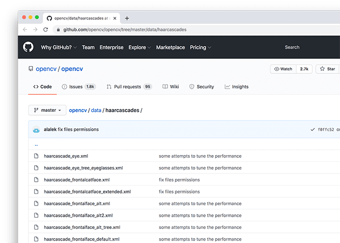 $ tree . --dirsfirst . āāā cascades ā āāā haarcascade_eye.xml ā āāā haarcascade_frontalface_default.xml ā āāā haarcascade_smile.xml āāā opencv_haar_cascades.py 1 directory, 4 files