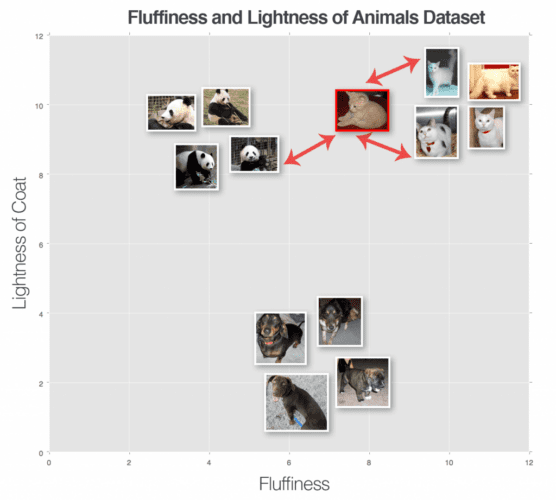 In order for the k-NN algorithm to work, it makes the primary assumption that images with similar visual contents lie close together in an n-dimensional space. Here, we can see three categories of images, denoted as dogs, cats, and pandas, respectively. In this pretend example we have plotted the “fluffiness” of the animal’s coat along the x-axis and the “lightness” of the coat along the y-axis. Each of the animal data points are grouped relatively close together in our n-dimensional space. This implies that the distance between two cat images is much smaller than the distance between a cat and a dog.