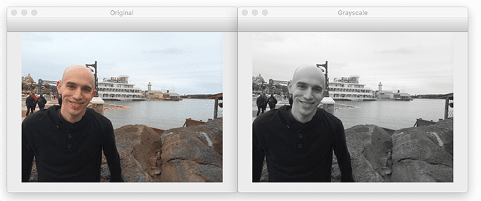 A grayscale representation of an image throws away the color information of an image and can also be done using the cv2.cvtColor function: