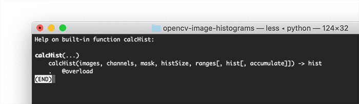 We will be using the cv2.calcHist function to build our histograms. Before we get into any code examples, let’s quickly review the function: