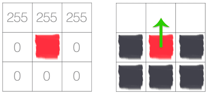 In the image above, we examine the 3×3 neighborhood surrounding the central pixel. Our x values run from left to right, and our y values from top to bottom. In order to compute any changes in direction we’ll need the north, south, east, and west pixels, which are marked on Figure 3.