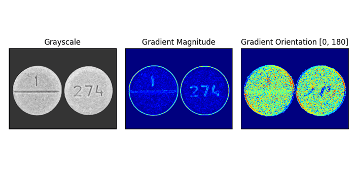 The image on the left contains our input image of a prescription pill meditation. We then compute the gradient magnitude in the middle and display the gradient orientation on the right.