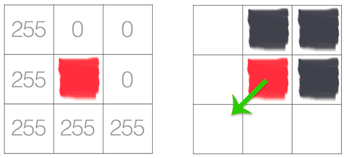 In this particular image, we can see that the lower-triangular region of the neighborhood is white, while the upper-triangular neighborhood is black. Computing both Gx and Gy we arrive at: