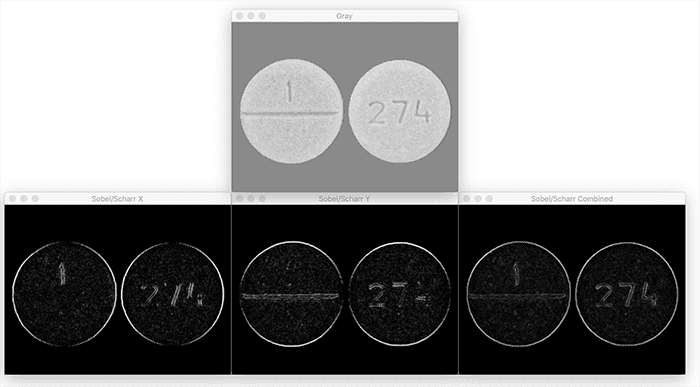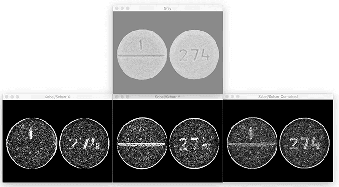 Here, we have computed the Sobel gradient representation of the pill. The outline of the pill is clearly visible, as well as the digits on the pill itself.