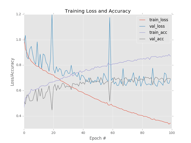 Around epoch 60 our testing accuracy saturates — we are unable to get past ≈70% classification accuracy, meanwhile our training accuracy continues to climb to over 85%. Again, gathering more training data, applying data augmentation, and taking more care to tune our learning rate will help us improve our results in the future.