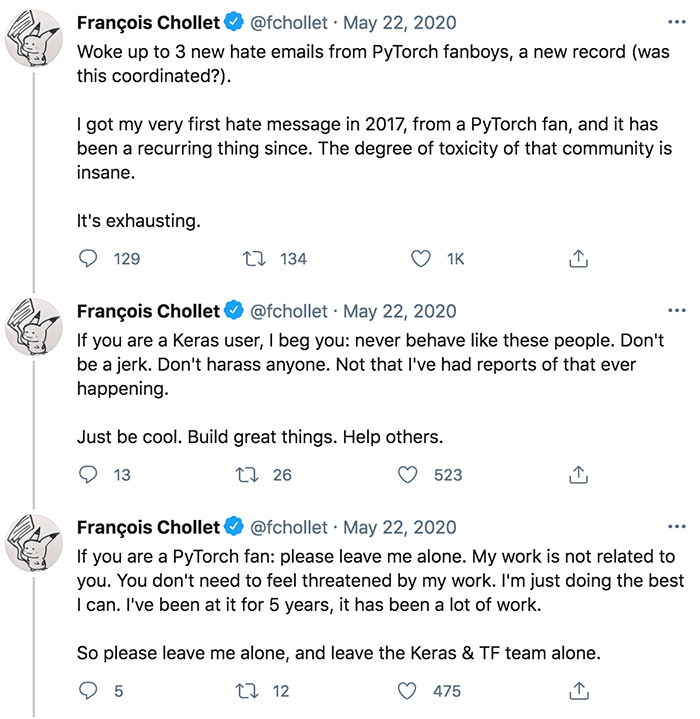 Unfortunately, we humans tend to get āentrenchedā in our thinking once we become loyal to a particular camp or group. The entrenchment surrounding PyTorch versus Keras/TensorFlow can sometimes get ugly, once prompting FranƧois Chollet, the creator of Keras, to ask PyTorch users to stop sending him hate mail: