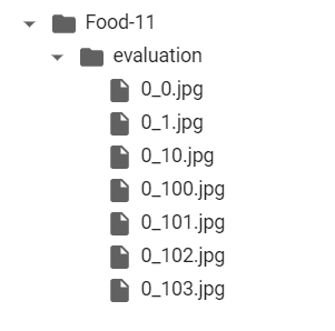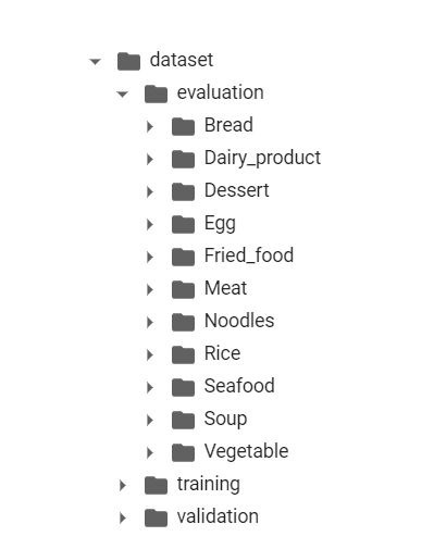 Each filename is in the format class_index_imageNumber.jpg. For example, the file 0_10.jpg refers to an image belonging to the Bread label. Images from all classes are grouped together. In our custom dataset, we will arrange images by their labels and put them in their respective folder with label names. So, after the data preparation, our dataset structure will look something like Figure 4: