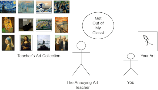 You recently enrolled in an art class, where the art teacher is extremely harsh and strict. When you hand in your first painting, the art teacher is aghast. He threatens to have you expelled until you can make a spectacular masterpiece.