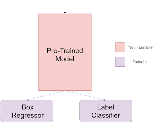 The second thing to remember is that only the box regressor and the label classifier will have trainable weights. The weights of the pre-trained model will be left untouched, as shown in Figure 4.