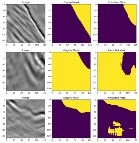 Figure 5 shows sample visualization outputs from our make_prediction function. The yellow region represents Class 1: Salt and the dark blue region represents Class 2: Not Salt (sediment).