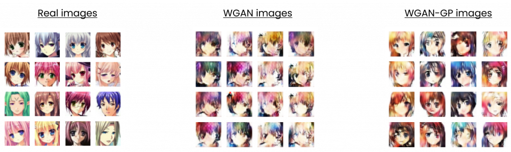 In this post, we implement two GAN variants: Wasserstein GAN (WGAN) and Wasserstein GAN with Gradient Penalty (WGAN-GP), to address the training instability discussed in my previous post, GAN Training Challenges: DCGAN for Color Images. We will train the WGAN and WGAN-GP models to generate colorful 64×64 anime faces.