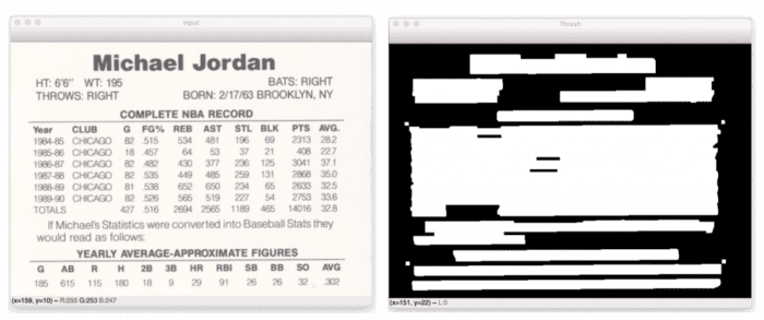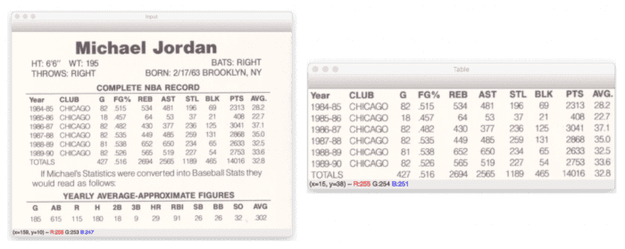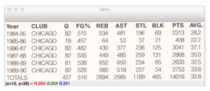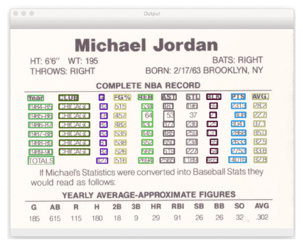 $ python multi_column_ocr.py --image michael_jordan_stats.png --output results.csv +----+---------+---------+-----+---------+-------+-------+-------+-------+-------+--------+ | | Year | CLUB | G | FG% | REB | AST | STL | BLK | PTS | AVG. | |----+---------+---------+-----+---------+-------+-------+-------+-------+-------+--------| | 0 | 1984-85 | CHICAGO | 82 | 515 | 534 | 481 | 196 | 69 | 2313 | 282 | | 1 | 1985-86 | CHICAGO | 18 | 0.457 | 64 | 53 | ar | A | 408 | 227 | | 2 | 1986-87 | CHICAGO | 82 | 482 | 430 | 377 | 236 | 125 | 3041 | 37.1 | | 3 | 1987-88 | CHICAGO | 82 | 535 | 449 | 485 | 259 | 131 | 2868 | 35 | | 4 | 1988-89 | CHICAGO | 81 | 538 | 652 | 650 | 234 | 65 | 2633 | 325 | | 5 | 1989-90 | CHICAGO | 82 | 526 | 565 | 519 | 227 | 54 | 2763 | 33.6 | | 6 | TOTALS | | 427 | 516 | 2694 | 2565 | 1189 | 465 | 14016 | 328 | +----+---------+---------+-----+---------+-------+-------+-------+-------+-------+--------+ [INFO] saving CSV file to disk...