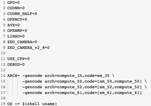# Enable the OpenCV, CUDA, CUDNN, CUDNN_HALF & LIBSO Flags and Compile Darknet $ sed -i 's/OPENCV=0/OPENCV=1/g' Makefile $ sed -i 's/GPU=0/GPU=1/g' Makefile $ sed -i 's/CUDNN=0/CUDNN=1/g' Makefile $ sed -i 's/CUDNN_HALF=0/CUDNN_HALF=1/g' Makefile $ sed -i 's/LIBSO=0/LIBSO=1/g' Makefile $ make