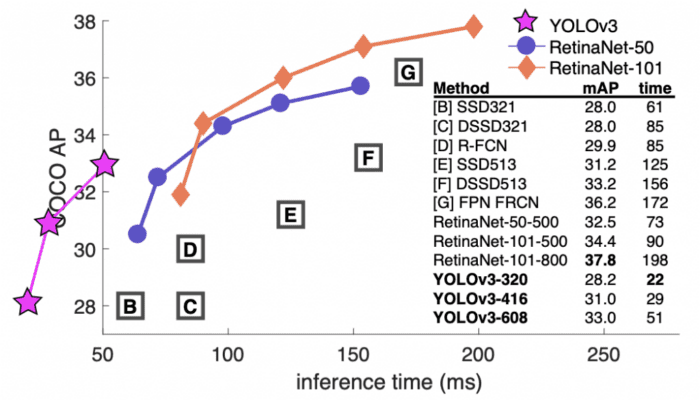 -axis (Redmon and Farhadi (2018), p. 1, fig. 1).Unlike before, in YOLOv3, the authors compare the mAP at various IOUs; at 0.5 IOU, it achieves 57.9 in 51ms compared to 57.5