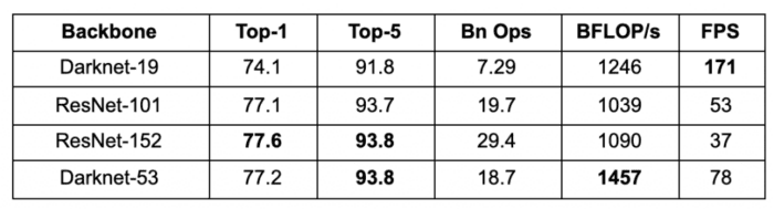 Darknet-53 network architecture is more potent than Darknet-19 and more efficient than ResNet-101 and ResNet-152. As shown in Table 2, Darknet-53 performs more billion floating-point operations per second than other backbone architectures, making it efficient. This also means the network structure better utilizes the GPU, making it more efficient to evaluate and thus faster. Furthermore, in terms of Top-1 and Top-5 image classification accuracy, Darknet-53 performs better than Darknet-19 and performs similar to ResNet. The below results are benchmarked on the ImageNet dataset, and inference is computed on a Titan X GPU.