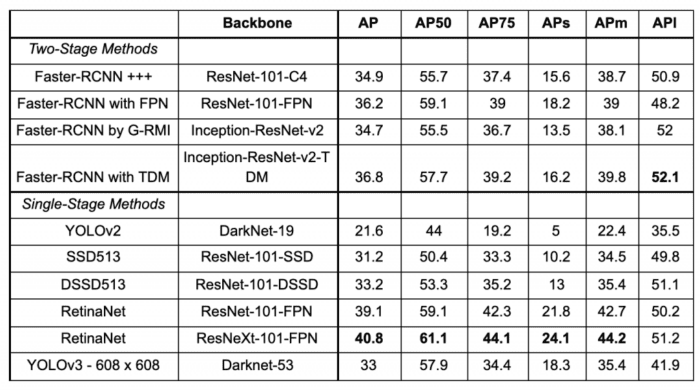 This section compares YOLOv3 (trained with input resolution) with state-of-the-art two-stage and single-stage object detectors benchmarked on the COCO dataset. As shown in Table 3, YOLOv3 does a decent job in mAP though it’s not the best. The table shows various AP columns; however, in previous YOLO versions, the performance was benchmarked on just AP50 (i.e., at 0.5 IOU). These different AP columns measure the performance of the models in a more fine-grained way; here, AP{50,75} is average precision at 0.5 and 0.75 IOU, AP{s,m,l} means average precision for small, medium, and large objects.