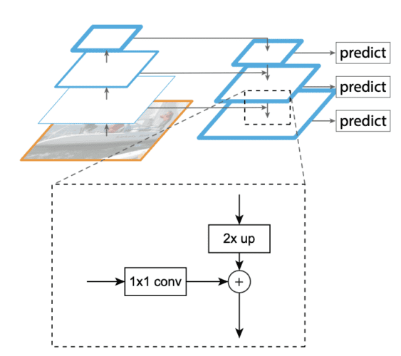 The network extracts features from each of the three scales using a similar concept to feature pyramid networks or FPN. We will not detail what feature pyramid networks are, but in short, the structure of FPN has a bottom-up pathway, top-down pathway, and lateral connections (Figure 5). The idea behind using FPN is to improve ConvNet’s pyramidal feature hierarchy having varying level semantics and build feature pyramids with high-level semantics throughout. And the goal is to combine low-resolution features (in later layers of the network), which are very informative, with high-resolution features (in initial layers of the network). Thus, FPN helps improve the problem of recognizing objects that are at vastly different scales.