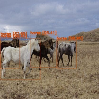 In Figure 11, the model did well by detecting four out of the five horses and with a very high confidence score. However, recall both YOLOv1 and YOLOv2 struggled with this image by either predicting a horse like a cow or failing to detect one of the four horses, and both models predicted them with a very low confidence score.