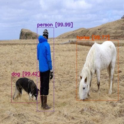 In Figure 10, the model detects all three objects correctly again with 100% confidence. If you remember, YOLOv1 detected a horse as a sheep, while YOLOv2 predicted a horse twice as a horse and sheep.