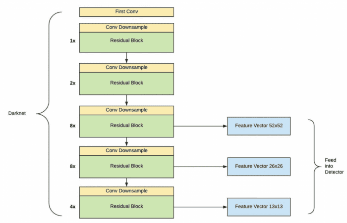 The Darknet-53 architecture was trained on the image classification task with the ImageNet dataset in the pretraining step. The architecture is simple and self-explanatory, but let’s look at some of the main components. After every convolutional layer, a residual group (shown with a rectangle) has varying residual blocks such as 1x, 2x, 4x, and 8x. To downsample the spatial dimension of the feature maps, strided convolution with a stride of 2 is used before every residual group. This helped prevent the loss of low-level features and encode positional information useful for object detection; moreover, since strided convolution has parameters, the downsampling would not be entirely non-parametric as max-pooling. It improved the ability to detect smaller objects.