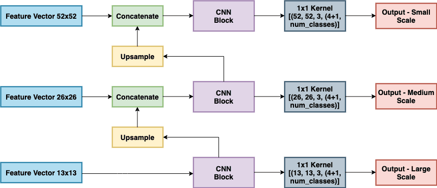 From Figure 6, we can see that several convolutional layers are added on top of the base feature extractor. The last layer for each scale predicts a 3D tensor encoding: bounding box coordinates, objectness score, and class predictions. For the COCO dataset, three bounding boxes are predicted at each scale (three-box priors/anchors for each scale). So the output prediction tensor is for the four bounding box offsets, one objectness score prediction, and 80 class predictions. For detecting medium-scale objects, large-scale features are upsampled and concatenated. Similarly, for detecting small-scale objects, medium-scale features are upsampled and concatenated. This setting allowed small-scale detection to benefit from both medium and large detections.