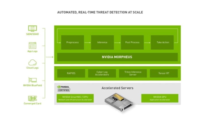 NVIDIA Morpheus (Figure 4) is a machine learning framework that identifies, captures, and takes action on cyber threats and anomalies that are new or previously difficult to identify. These include leaks of unencrypted data, phishing attacks, and malware. It analyzes security data without compromising cost or performance by applying real-time telemetry, policy enforcement, and edge processing.