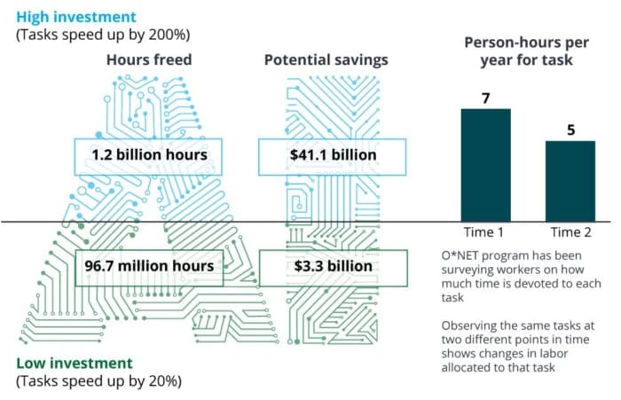 - Operational efficiency: Deloitte (Figure 2) has estimated that automation could save U.S. Government employees between 96.7 million to 1.2 billion hours a year, resulting in potential savings of between $3.3 billion to $41.1 billion a year. While it could lead to the government reducing the number of employees, they can be reinforced into more rewarding work that requires lateral thinking, empathy, and creativity.