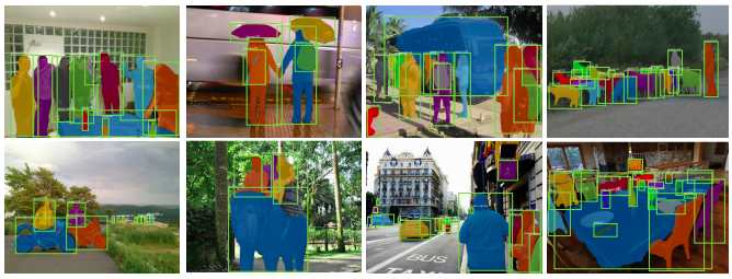 Panoptic segmentation assigns each pixel only one pair of a semantic label and an instance identifier. However, objects can have overlapping pixels. In this case, panoptic segmentation resolves the discrepancy by favoring the object instance, as the priority is to identify each thing rather than stuff. Figure 3 demonstrates different panoptic segmentation detections.
