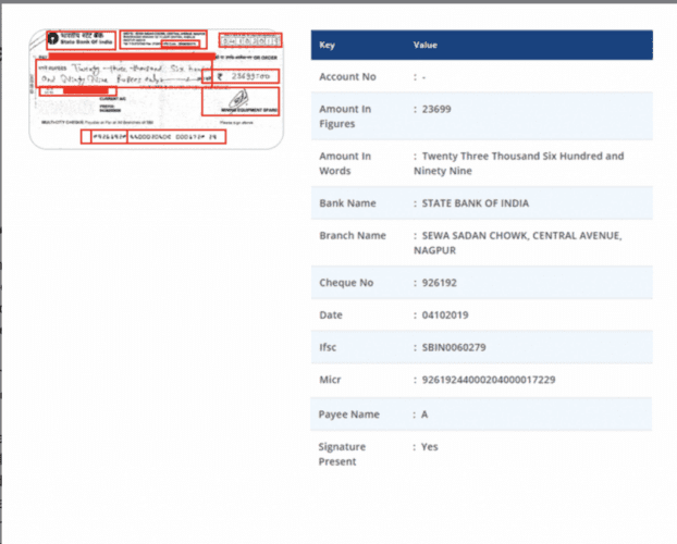 Arya.ai (Figure 8) automates check-processing and clearing using 6 different AI models for various fields, including date, magnetic ink character recognition (MICR), the amount in words and figures, account number, and signature extraction and verification. It can process 15-20 checks per second on standard production infrastructure.