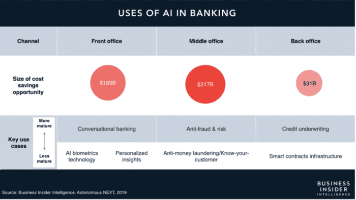 According to Business Insider (Figure 1), by using AI applications, banks will save around $447 billion by 2023. The front and middle offices will account for $416 billion. According to TCS research, “banking and FS executives found that investment in AI helped them reduce production costs by 13%. Additionally, executives reported a 17% average revenue increase in the area of their AI initiatives.”